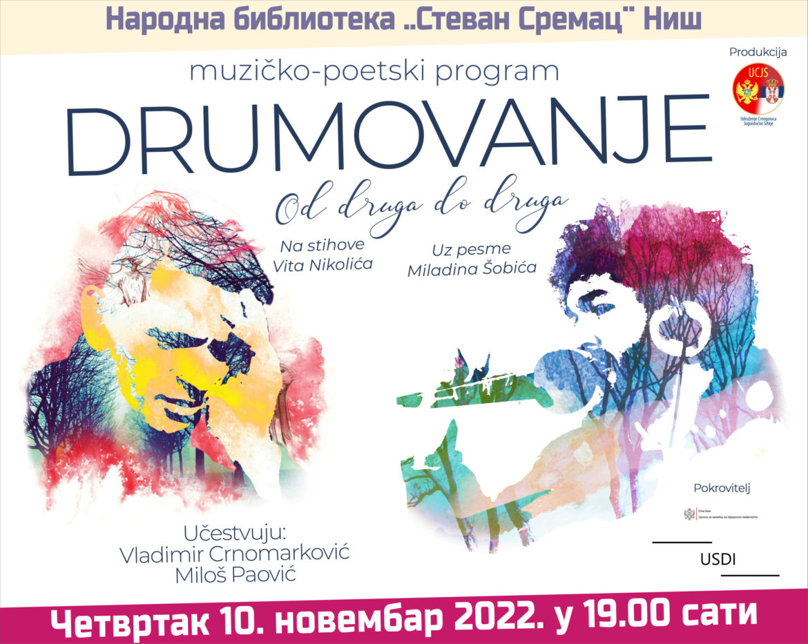U četvrtak, 10. novembra 2022. godine u 19.00 sati u Narodnoj biblioteci „Stevan Sremac“, biće izveden muzičko-poetski program „Drumovanje – od druga do druga“.