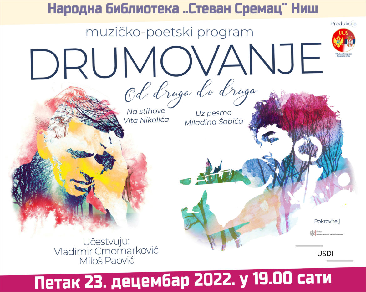 U petak, 23. novembra 2022. godine u 19.00 sati u Narodnoj biblioteci „Stevan Sremac“, biće izveden muzičko-poetski program „Drumovanje – od druga do druga“.