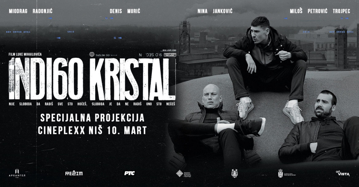 Specijalna projekcija novog domaćeg filma ,,Indigo Kristal” zakazana je za petak, 10. mart od 20 časova u Cineplexx Nš bioskopu. Gostima bioskopa predstaviće se i deo autorske i glumačke ekipe filma nakon projekcije.
