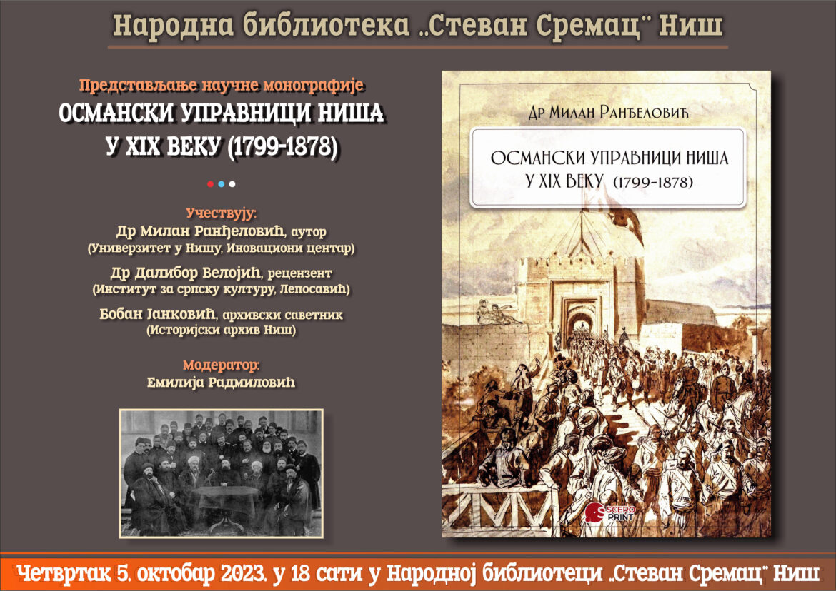U četvrtak, 5. oktobra 2023. godine sa početkom u 18.00 sati, u Narodnoj biblioteci „Stevan Sremac” Niš biće predstavljena naučna monografija „Osmanski upravnici Niša (1799-1878)” dr Milana Ranđelovića.