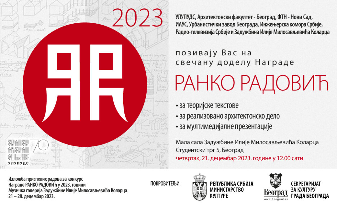 Svečana dodela Nagrade Ranko Radović 2023. održaće se u četvrtak, 21. decembra 2023. godine u 12.00 sati u Maloj Sali Zadužbine Ilije M. Kolarca, Studentski trg 5, Beograd.