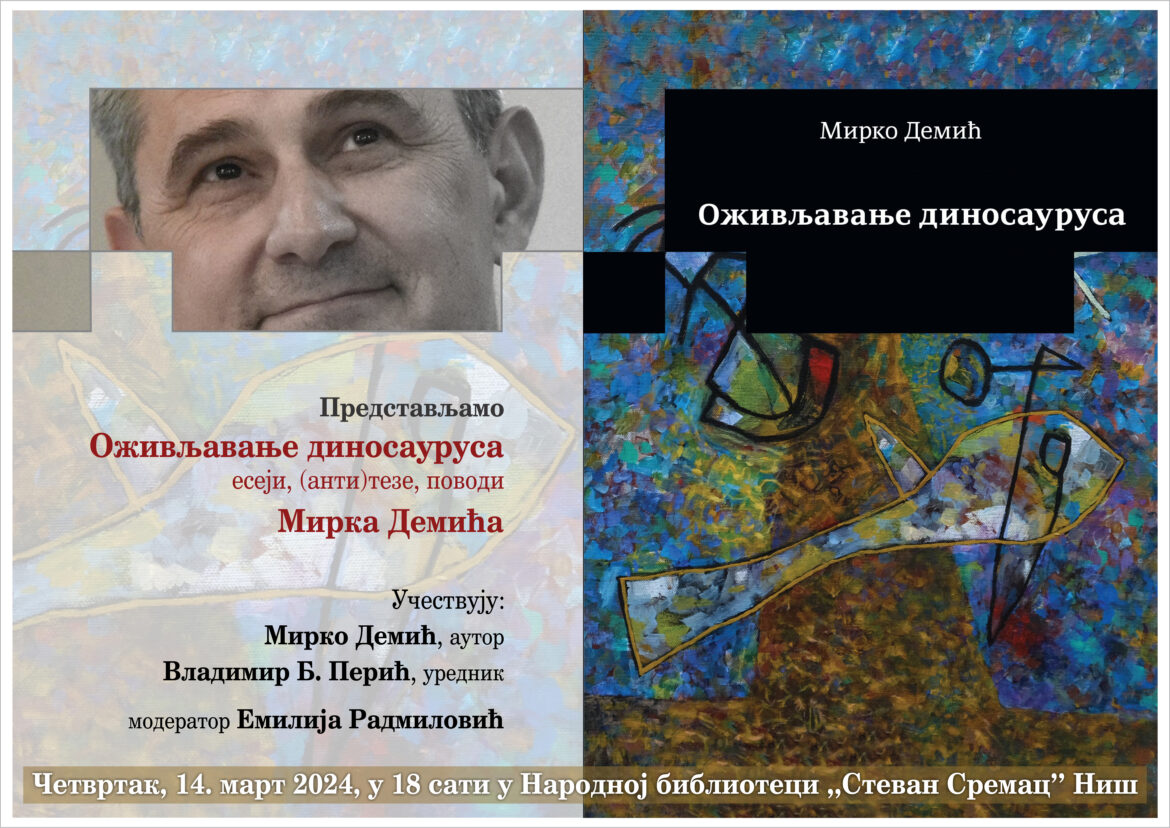 U četvrtak, 14. marta 2024. godine, sa početkom u 18 sati, u Narodnoj biblioteci „Stevan Sremac” Niš biće predstavljena knjiga eseja „Oživljavanje dinosaurusa” srpskog književnika Mirka Demića. Pored autora, o knjizi će govoriti njen urednik dr Vladimir B. Perić, glavni i odgovorni urednik književnog časopisa „Koraci”. Moderator večeri je Emilija Radmilović.