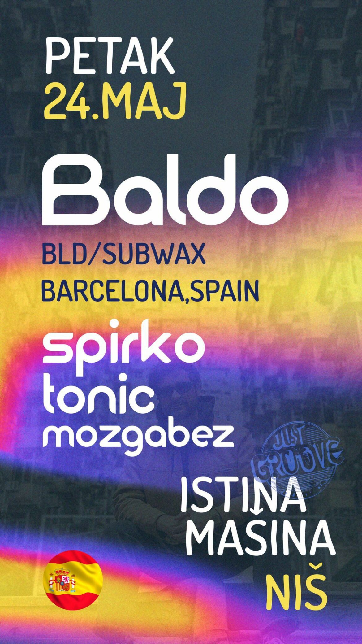 Just Groove organizacija će u petak, 24. maja, počastiti publiku žurkom u prostoru “Istina mašina”. Dašak Španije u naš grad doneće DJ Baldo iz Barselone, dok će za domaću podršku biti zaduženi Spirko, Mozgabez i Tonic. Baldu će gostovanje u Nišu biti prilika da se po prvi put susretne sa srpskom publikom, a već sledećeg dana nastupiće u Zagrebu.