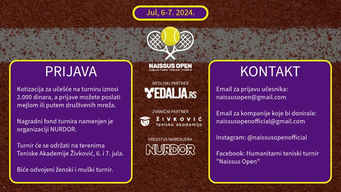 Naissus open, peti humanitarni teniski turnir, biće održan 6. i 7. jula na terenima Teniske akademije Živković u Nišu. Čitav nagradni fond turnira biće usmeren organizaciji NURDOR.