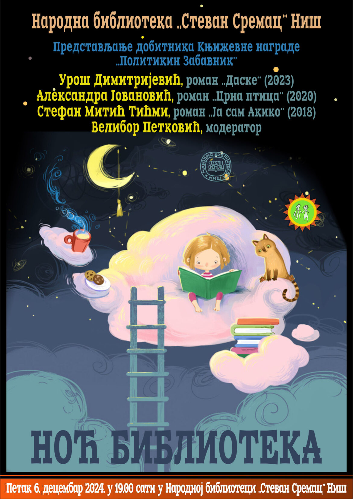 U okviru manifestacije „Noć biblioteka”, u petak 6. decembra 2024. godine, sa početkom u 19 časova, u Narodnoj biblioteci „Stevan Sremac” biće predstavljeni dobitnici Književne nagrade „Politikin Zabavnik”. Manifestacija „Noć biblioteka” organizuje se prvi put na inicijativu Ministarstva kulture Republike Srbije, u organizaciji Narodne Biblioteke Srbije. U ovoj godini, takođe „Politikin Zabavnik” obeležava 85 godina postojanja.