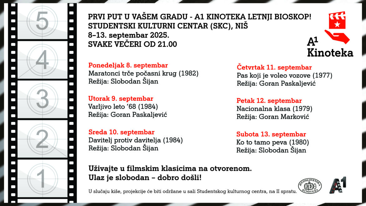 U organizaciji A1 Srbija i Jugoslovenske kinoteke, od 8. do 13. septembra, u bašti Studentskog kulturnog centra (SKC) Niš, svakog dana od 21 čas publika će moći da uživa u digitalno restaurisanim domaćim klasicima. Na programu će se naći legendarna ostvarenja poput filma „Maratonci trče počasni krug’’, koji otvara niški ciklus, kao i „Varljivo leto ’68’’, „Davitelj protiv davitelja’’, „Pas koji je voleo vozove’’, „Nacionalna klasa’’ i „Ko to tamo peva’’, a sve projekcije za digitalno restaurisane domaće klasike su besplatne.
