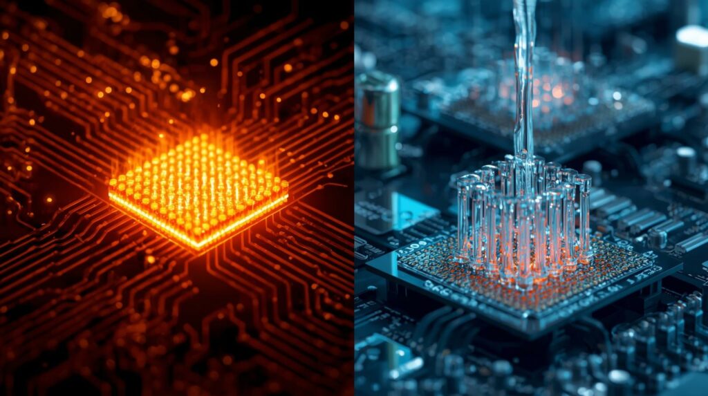 2. Tradicionalno tečno hlađenje: Cevi sa vodom koje prolaze kroz „vodene blokove“ postavljene na vrh čipova. Iako efikasnije od vazduha, i ovo rešenje postaje nedovoljno za ekstremnu gustinu toplote koju generišu najnoviji AI akceleratori.