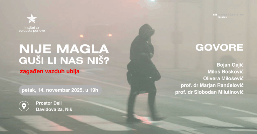 Tribina “Nije magla. Guši li nas Niš?” biće održana večeras u Deli prostoru u Davidovoj ulici broj 2a u Nišu od 19.00 časova.