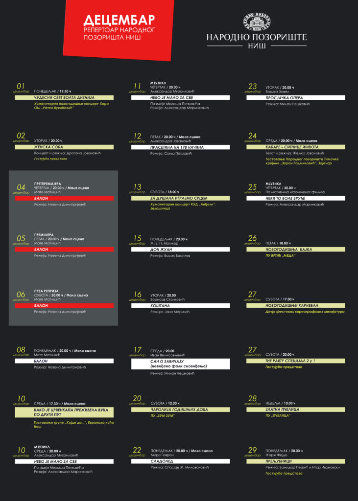 Pozorišta Repertoar Narodnog pozorišta Niš za decembar od strane bukovac 04/12/2025 Podeli 0FacebookTwitterLinkedinThreadsBlueskyEmail 77 Portal Media Press Srbija donosi repertoar Narodnog pozorišta Niš za decembar. Na samom početku meseca, očekuje nas premijera predstave ,,Balon” Mate Matišića, u režiji Nevene Dimitrijević 5. decembra u 20 časova na Maloj sceni. Autor vizuala: Narodno pozorište Niš Naslovna fotografija: Portal Media Press Srbija Autor: Portal Media Press Srbija Slične vesti Premijera predstave ‘Igre u pesku’ 9. decembra u Akademskom pozorištu SKC Niš Pozorište lutaka Niš na nacionalnim i međunarodnim festivalima tokom aprila i maja Repertoar Narodnog pozorišta Niš za januar 2025. godine Počeo rad na predstavi ,,Don Žuan“ u Narodnom pozorištu Niš BalondecembarNarodno pozorište Nišpremijera predstaveRepertoarRepertoar Narodnog pozorišta Niš Podeli 0 FacebookTwitterLinkedinThreadsBlueskyEmail previous post Specijalna projekcija filma ‘Povratak Žikine dinastije’ 5. decembra u bioskopu Cine Grand next post Predstavljanje dve knjige pripovedaka Negoslave Stanojević u Narodnoj biblioteci ‘Stevan Sremac’ Slične vesti Predstava ‘Mačak u čizmama’ na 56. susretima profesionalnih pozorišta lutaka Srbije 03/12/2025 Nagrade na Festivalu prvoizdenih predstava – PIP 2025 u Aleksincu 01/12/2025 Dve nagrade na Prvom međunarodnom festivalu Pozorišta za decu i mlade „Osmeh... 01/12/2025 ‘Menopauza – stand up sa Tijanom’ 10. decembra u bioskopu Cine grand... 21/11/2025 Gala koncert Opere Narodnog pozorišta u Beogradu na sceni niškog teatra 31/10/2025 Počele probe za predstavu „Opasne veze“ 22/10/2025