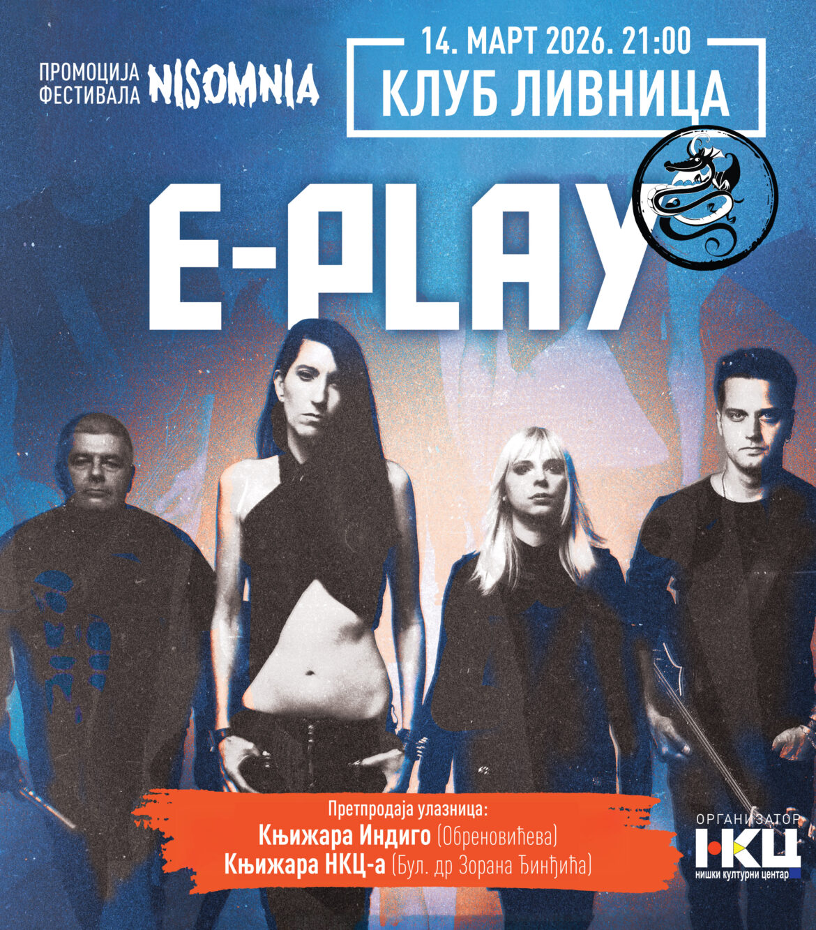 U okviru promocije festivala Nisomnija, Niški kulturni centar organizuje nastup alternativnog sastava E-Play iz Beograda, u subotu 14. marta 2026. godine, u klubu „Livnica“ u Nišu. Koncert počinje u 21 sat.